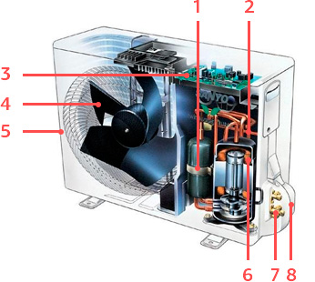 Вентилятор — создает поток воздуха, обдувающего конденсатор (радиатор внешнего блока). Вентилятор может иметь 2 - 3 фиксированные скорости вращения или же плавную регулировку
