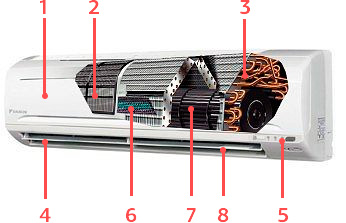Передняя панель — представляет собой пластиковую панель, через которую поступает воздух во внутренний блок. Панель легко снимается для проведения сервисного обслуживания кондиционера (чистки фильтров, дезинфекция блока, очистки испарителя)